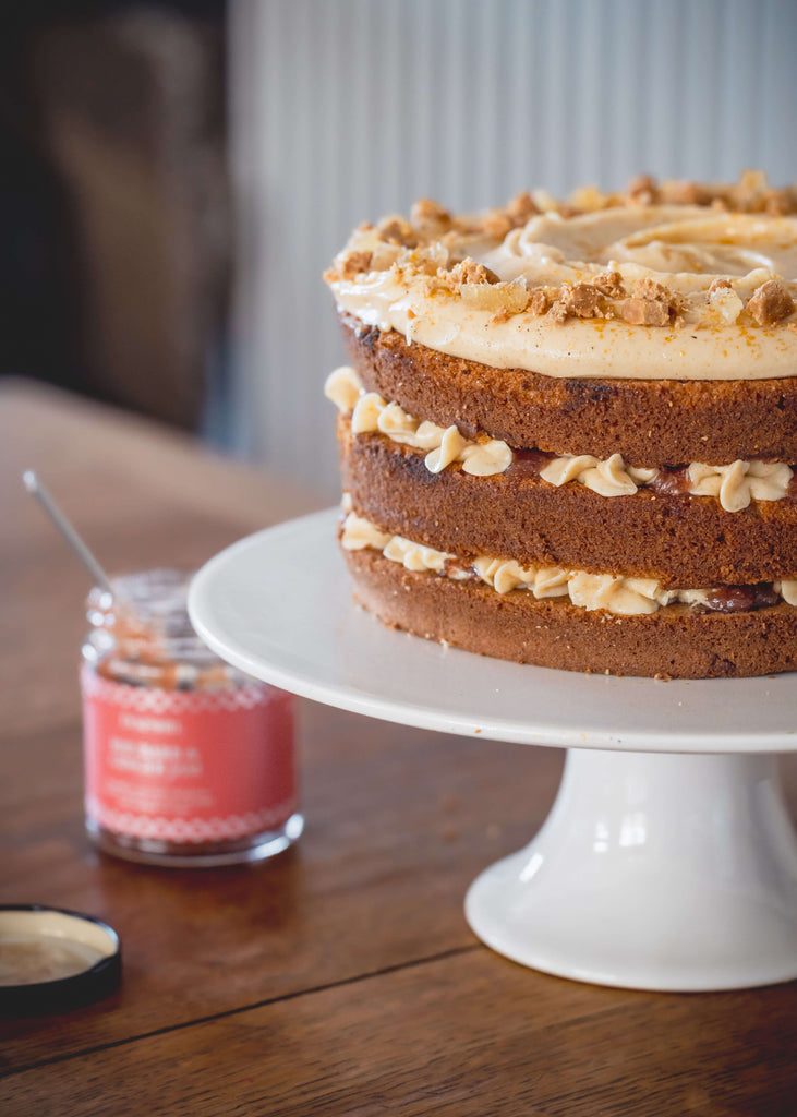 Step 12 Pipe buttercream over the jam. Add the next sponge and repeat the process. For the final sponge, add the drizzle of honey and black pepper and finish with a layer of buttercream. Add crumbled fudge around the circumference to decorate.