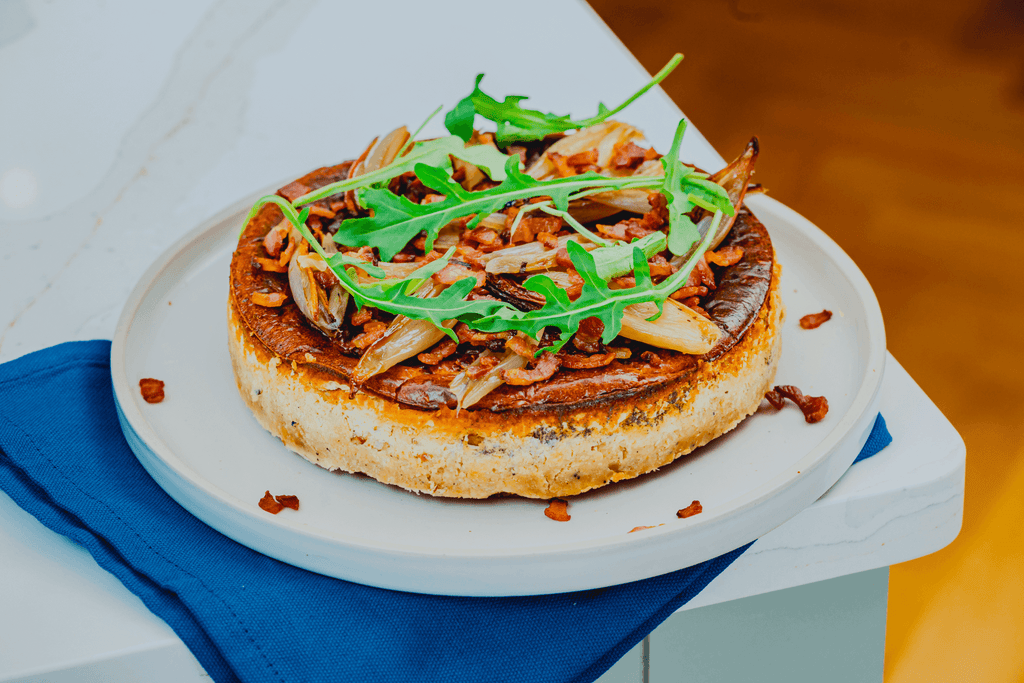 Step 7 To serve, run a knife around the cheesecake, before opening the springform clasp and placing the cheesecake onto your serving plate. Squeeze the shallots out of their peel and place neatly on top of the cheesecake. Sprinkle the remaining bacon lardons over, then garnish with rocket leaves. Serve generous slices with caramelised onion chutney on the side and pickled gherkin.