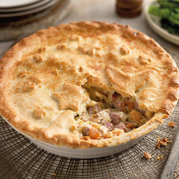 Step 3 Pour in the wine and allow to bubble for a minute then gently add the stock little by little. Allow to come to a gentle simmer and for the sauce to thicken. Take off the heat and stir in the ham, chicken, mustard, crème fraîche, tarragon and seasoning to taste. Transfer the pie filling to a buttered pie dish. Position your pie funnel in the centre.