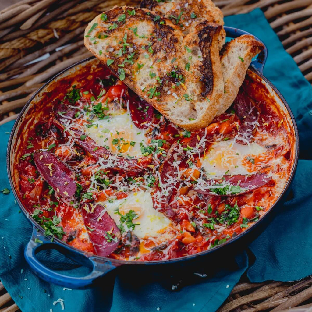 Step 5 Make four small wells in the sauce and carefully crack one egg into each well. Place the frying pan in the oven for 10 minutes, until the whites are set but the yolks are still runny.