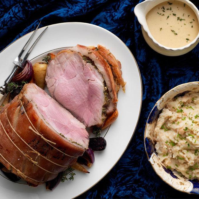 Step 7 Meanwhile make a gravy using the juices in the tin with 1 tbsp flour and 200ml white wine. Serve with roasted vegetables and cannellini bean mash.