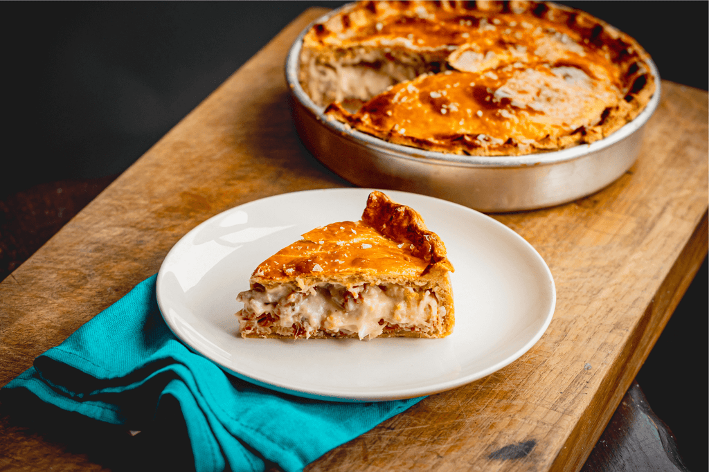 Step 6 Preheat an oven to 180c fan and cook for 45 minutes to an hour until the pastry is golden. You can glaze with egg wash again during cooking to achieve a nice golden pastry top. Remove from the oven and rest for 5 minutes before portioning and serving.