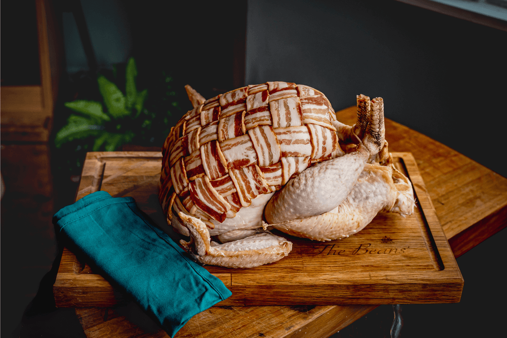 Step 7 Lift the parchment paper with the bacon and the turn it over the bird, placing the bacon weave onto the turkey breasts. Press down the bacon weave, then preheat the oven to 160c fan.