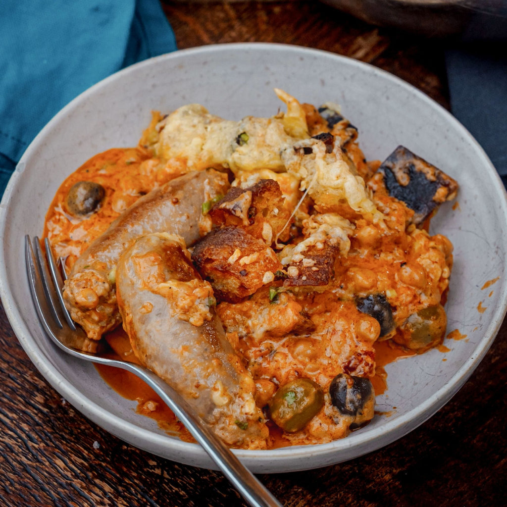 Step 5 Scatter the garlic bread cubes over the sausages, then add the grated Lord London cheese across the top. Transfer the pan, uncovered to the oven and bake for about 8 minutes until the topping is golden, crisp and bubbling. Serve straight from the pan while the garlic bread is hot and the sauce is creamy.