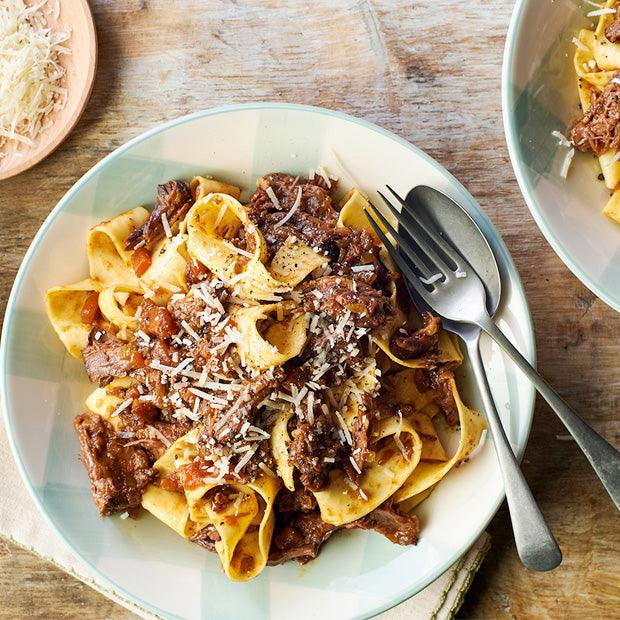 Step 12 Serve on a bed of pasta, preferably pappardelle as the ragu will cling to this the best. Sprinkle some parmesan on top.