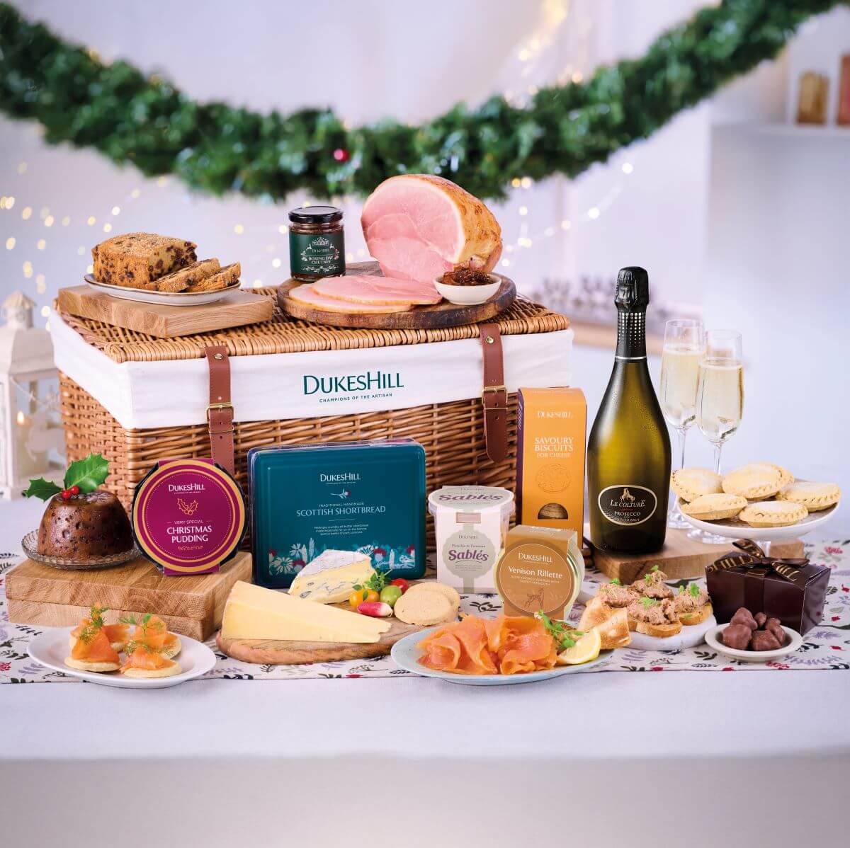 A festive feast in a hamper – this 14-piece artisan Christmas selection features DukesHill favourites including boneless ham, smoked salmon, award-winning pudding and Sylvoz Prosecco, all beautifully presented in a 20" wicker basket.